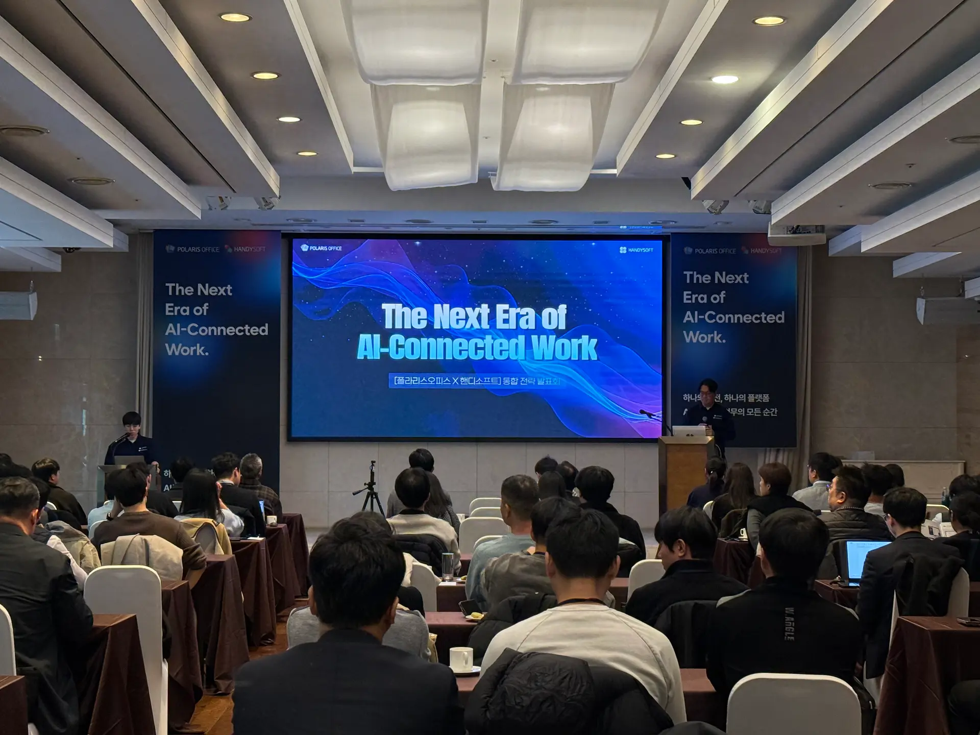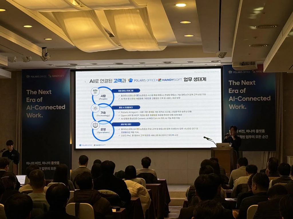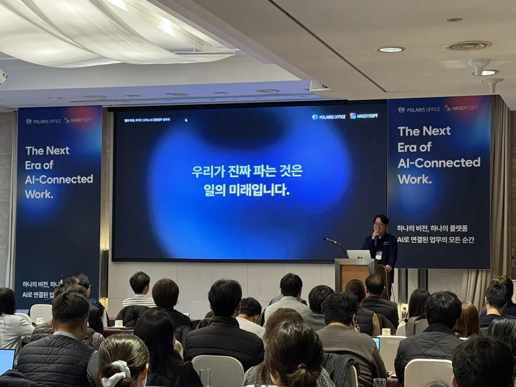 지난 11월 19일, 폴라리스오피스와 핸디소프트가 함께 ‘AI 기반 통합 업무 생태계’ 전략을 공개했습니다. ‘The Next Era of AI-Connected Work’라는 주제로 열린 이번 행사는 두 회사가 공공 및 기업 고객을 위해 그룹웨어-오피스-AI 플랫폼을 하나로 통합하는 본격적인 행보의 시작을 알리는 자리였습니다.