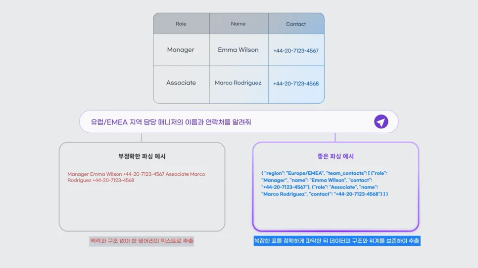 복잡한 문서의 레이아웃을 고려하지 않고 파싱이 진행될 경우, 제대로 된 데이터를 추출하기 어려워요. 좌측에서 진행된 파싱은 표의 행과 열을 제대로 뽑아내지 못하는 걸 볼 수 있죠. 잘못된 데이터는 곧 답변의 오류로 이어질 거예요.